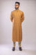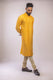 Yellow cotton-silk kurta for men with falling geometric embroidery from shoulder to chest and buti details on the collar. Ideal for haldi, puja, bhaat, and festive day events.